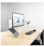 De anti-slip pads aan de onderzijde van de standaard zorgen ervoor dat je laptop stevig op zijn plek blijft, ongeacht de ondergrond. Dit geeft je het vertrouwen dat je apparatuur veilig is tijdens het werken. Daarnaast is de standaard gemaakt van duurzaam aluminium, wat niet alleen zorgt voor een moderne uitstraling, maar ook voor de nodige stabiliteit en een lange levensduur.
