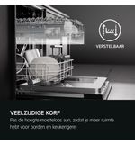 Met genoeg capaciteit om de vaat van een uitgebreid diner of een groot gezin moeiteloos de baas te kunnen, biedt deze vaatwasser een handige oplossing voor elke situatie. Het unieke rekontwerp zorgt ervoor dat niet alleen borden en bestek, maar ook grotere pannen en delicate glazen veilig en efficiënt kunnen worden gereinigd. Dankzij de QuickSelect touch-bediening kun je eenvoudig het gewenste programma selecteren, terwijl de satelliet-sproeiarm ervoor zorgt dat elke hoek van de vaatwasser wordt bereikt, voor een grondige reiniging.