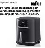 De elegantie van het zwarte ontwerp maakt deze airfryer een fraaie aanvulling in iedere keuken. Zijn moderne uitstraling en slimme functionaliteiten roepen een gevoel van gebruiksgemak en verfijning op. Het royale formaat biedt voldoende capaciteit om een complete maaltijd voor het hele gezin te bereiden. Of het nu gaat om knapperige frietjes, gegrilde groenten of zelfs een heerlijke ovenschotel, met de Braun HF5050 weet je dat je het allemaal kunt creëren met gemak en plezier.