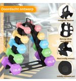 Het rek is vervaardigd uit hoogwaardige materialen die duurzaamheid en sterkte waarborgen. Dit betekent dat jouw halters veilig en stevig op hun plaats blijven, zelfs tijdens intensieve trainingssessies. Geen zorgen meer over omvallende of ongeorganiseerde gewichten tijdens het sporten, want met dit halterrek blijft alles structureel op orde. De stevige constructie garandeert niet alleen dat je halters beschermd zijn, maar ook dat jij jezelf kunt concentreren op jouw workouts zonder je druk te maken over de mogelijkheid van ongelukken.