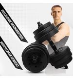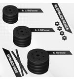 4 x 1,25 kg halterschijven 4 x 1,5 kg halterschijven 4 x 2 kg halterschijven 4 x schroefsluitingen 2 x dumbellstang 35 cm |