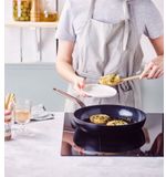 Als je de koekenpan voor het eerst oppakt, voel je meteen de stevigheid en kwaliteit. Het ergonomische handvat ligt comfortabel in de hand en zorgt voor een stevige grip tijdens het koken. De pan is licht van gewicht, waardoor je hem eenvoudig kunt hanteren. Het zwarte design geeft de pan een moderne uitstraling die in elke keuken stijlvol zal staan.