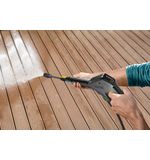 Met de bijgeleverde Vario Power-sproeier en de vuilfrees kun je de straal aanpassen aan de specifieke reinigingsklus. De Vario Power-sproeier biedt verschillende standen, van een brede en zachte straal voor delicate oppervlakken tot een smalle en krachtige straal voor hardnekkig vuil. De vuilfrees is ideaal voor het verwijderen van aangekoekt vuil en grotere oppervlakken.
