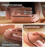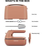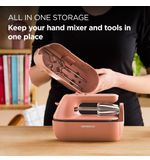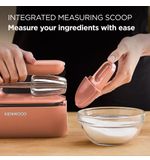 Deze handmixer is ook zeer gebruiksvriendelijk dankzij het slimme ontwerp. Het unieke alles-in-één opbergsysteem zorgt ervoor dat alle accessoires netjes en georganiseerd opgeborgen kunnen worden, wat niet alleen ruimte bespaart in jouw keuken, maar ook zorgt voor een opgeruimde uitstraling. Daarnaast beschikt de Kenwood QuickMix Go HMP40.000RD Clay Red over een geïntegreerde maatlepel, waardoor je altijd de juiste hoeveelheden ingrediënten toevoegt en jouw gerechten perfect in balans zijn.