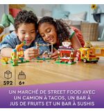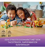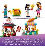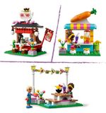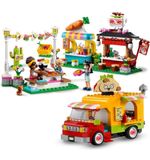 De set bevat ook diverse marktkraampjes met kleurrijke luifels en gedetailleerde accessoires. Van pizza's en hamburgers tot smoothies en popcorn, de mini-foodtrucks zijn gevuld met heerlijke lekkernijen waar elke minifiguur van zal watertanden. Bezoekers kunnen rondlopen, proeven en genieten van al het lekkers dat de markt te bieden heeft.