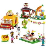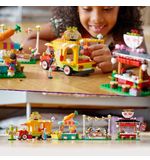 De LEGO Friends Streetfoodmarkt - 41701 bevat verschillende onderdelen, waaronder een voedselkraam, een frietkraam, een ijskiosk en een hotdogkraam. Je kunt deze bouwen zoals je wilt en je favoriete streetfood snacks serveren aan je vrienden. De markt is ook voorzien van een scooter, een surfplank, een skateboard, een privéjet, een strandscooter en meer. Er zijn ook vier LEGO Friendsfiguren meegeleverd, zodat je alles kunt verkennen en spelen.