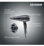 Met de Severin HT167 Haardroger integreert u kwaliteit en functionaliteit in uw verzorgingsroutine, en creëert u een moment van persoonlijke zorg dat uw zelfvertrouwen een boost geeft. Dit product is meer dan alleen een haardroger; het is een compagnon die uw dagelijkse rituelen verrijkt en bijdraagt aan uw welzijn. Ervaar de luxe en efficiëntie van deze haardroger en laat uw haar stralen als nooit tevoren.