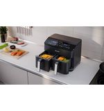 De Sharp AF-GD82AE-B dubbele Airfryer is de ideale toevoeging aan elke keuken voor liefhebbers van gemak en lekker eten. Met een totaal vermogen van 1800 Watt en twee ruime frituurmanden van elk 4 liter, stelt deze heteluchtfriteuse je in staat om snel en efficiënt diverse gerechten te bereiden. Of je nu wilt genieten van knapperige frietjes, sappige kippenvleugels of verse groenten, deze dubbele Airfryer biedt eindeloze culinaire mogelijkheden.